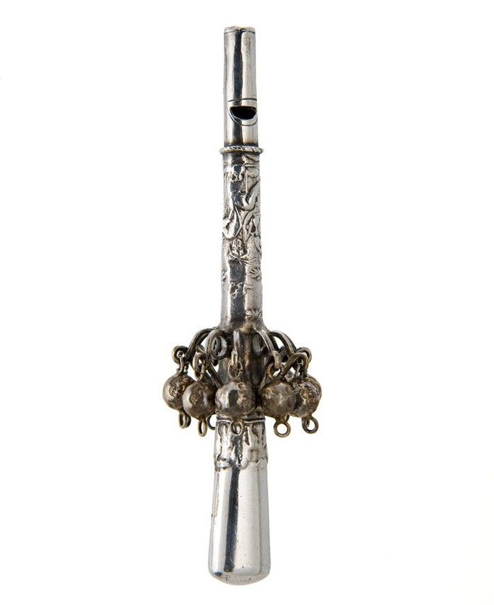 Zilveren rammelaar, staafvorm met fluit met geciseleerde voorstelling van drie heren met pofbroeken, zittend rond een tafel in een tuin, pijprokend met wijnkannen; tien consoles rondom de as waaraan met bloemen versierde belletjes hangen.