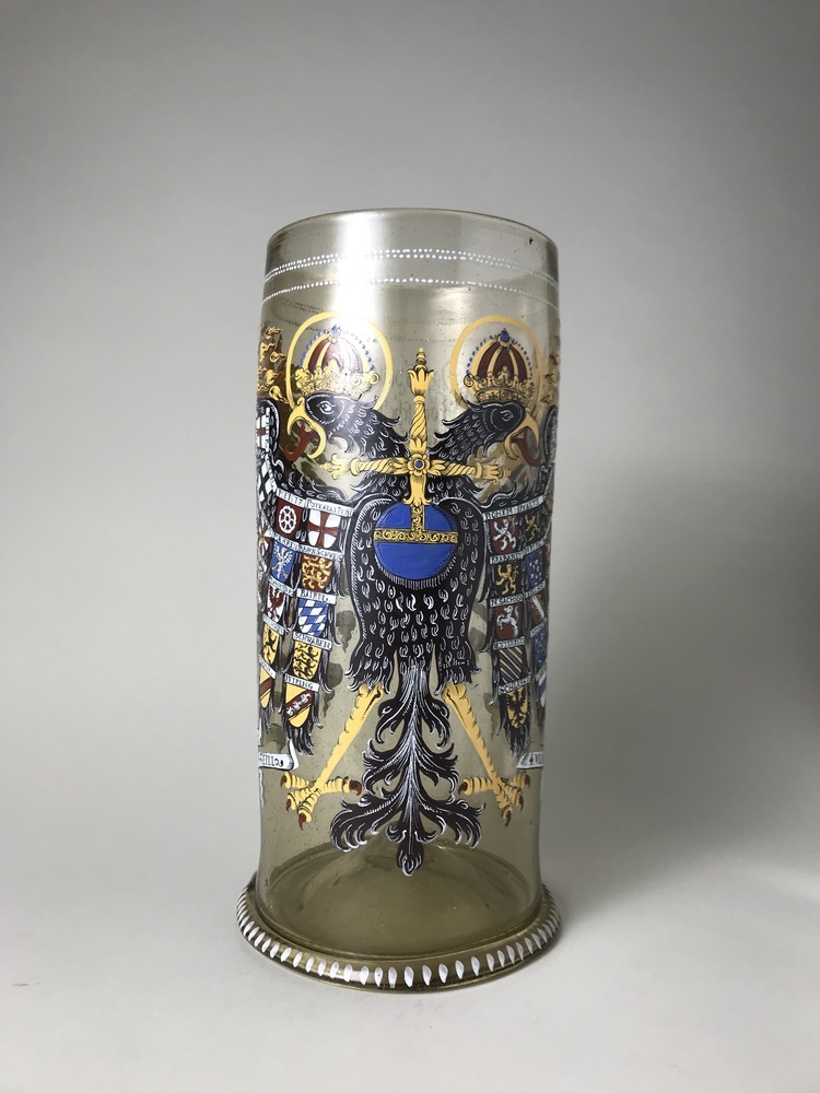 Helder geelgroen glas. Ingestoken bodem. Standring. Cilindrisch lichaam. Op lichaam een gekroonde tweekoppige adelaar met gespreide vleugels waarop de zesenvijftig wapens van de Quaterniones Imperii, de wapens van de Duitse keurvorsten, vorsten, rijksstanden en steden. Voor de borst de rijksappel met kruis. Bovenin de vleugels, horizontaal geordend, de wapens van de keurvorsten met opschriften. Links de kerkelijke: TRIER/ CÖLLN/ MENTZ/ POTESTAT ZV RO[M]/, rechts de wereldlijke: BÖHEM:/ PFALTZ/ SACHSSEN/ BRANDENBVRG/. Hieronder, in telkens zes verticale rijen, elk met tekstlint en verklarend opschrift, de wapens van de Quaterniones Imperii, van boven naar beneden, van links naar rechts: CÖLLN/ REGENSBR/ COSTNITZ/ SALTZBVRG/ met het tekstlint: 4: PAVRN/. AVGSPVRG/ METZ/ AACH/ LVBECK/ met het tekstlint: 4: STETTE/. LVNTPVRG/ WESTERBVR/ THVSSIS/ ALWALDEN/ met het tekstlint: 4 SEMPERFREIN/. NVRNBERG/ MAIDBVRG/ REINECK/ STRAMBERG/ met het tekstlint: 4 BVRGGRAVEN/. MAEHREN/ BRANDENBVRG/ MEICHSSEN/ BADEN/ met het tekstlint: 4 MARGGRAVEN/. BRAVNSCHWEIG/ BAIRN/ SCHWABEN/ LVTRING/ met het tekstlint: 4 SEILL/. Aan andere zijde van adelaar: BRABANDT/ N.SACHSSN/ WESTERREICH/ SCHLESSY/ met het tekstlint: 4. VICARI/. PFALTZ/ DVRING/ EDELSAS:/ HESSEN/ LVBECK/ met het tekstlint: 4: LANTGRAVEN/. CLEVE/ SAPHOY/ SCHWARTZBVR/ ZILLY/ met het tekstlint: 4: GRAVEN:/. ANDELAV/ WEISSENBACH/ FRANBERG/ STRVDECK/ met het tekstlint: 4: RITTER/. BAMBERG/ VLM/ HAGENAV/ SLETSTADT/ met het tekstlint: 4: DÖRFFER/. MAGDABVRG/ LVTZELBVRG/ ROttenBürG/ ALDENBVRG/ met het tekstlint: 4 BIRG/. Boven elke vleugel een Bourgondische vuurslag. Op achterzijde in wit email het opschrift: Daß Heillige/ Römische Reich/ Mitt Sampt/ Seinen Gliedern/ 1659./. De opschriften in gotische letters. Rondom bovenzijde lichaam sporen van vergulde band tussen witte stippellijnen, de bovenste dubbel. Op standring stippen in wit email.