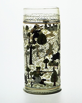 Helder kleurloos glas. Ingestoken bodem. Standring. Cilindrisch lichaam. Rondom lichaam een jachttafereel met kasteel. Hierboven een band met groene, blauwe en witte stippen tussen gele en blauwe lijnen. Standring met stippen in wit email.