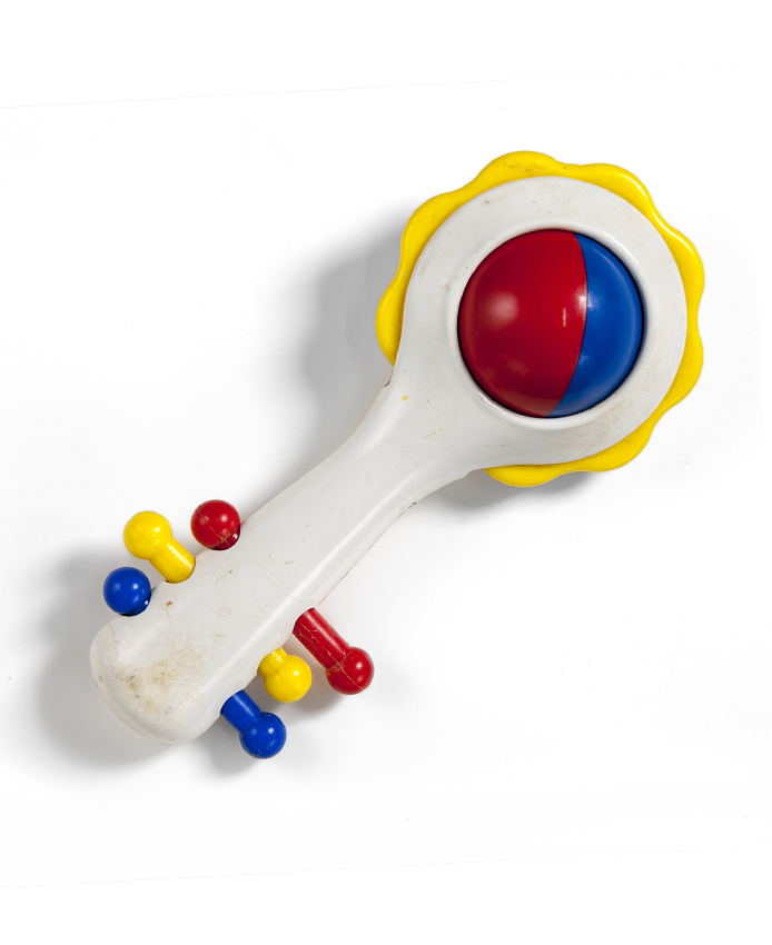 Plastic rammelaar met wit handvat met drie gekleurde bewegende staafjes; naar boven toe iets taps toelopend; bovenop een ronde vorm met daarin een draaiende blauw-rode bal en gele. draaibare. golvende ren.- Trefwoorden