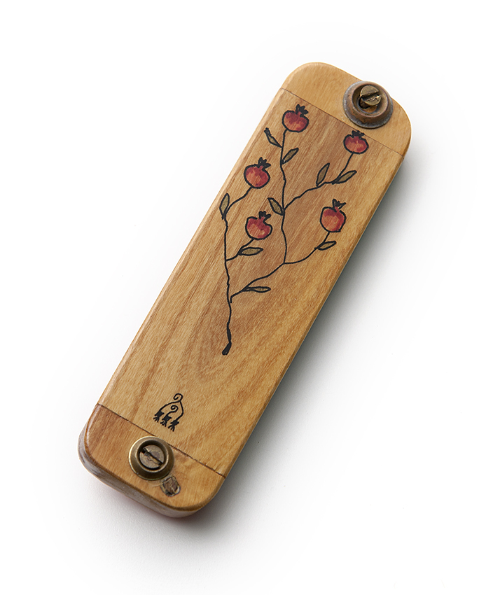 Mezoeza, rechthoekig, olijfhout beschilderd met een tak met granaatappels en de Hebreeuse letter Sjin. Rood kunstvilt aan de achterkant.- Trefwoorden