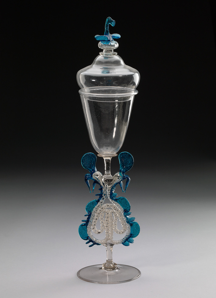Helder kleurloos glas, helder blauw glas, opaak wit glas. Platte voet met omgeslagen rand. Basisschijf. Stam met geribde en gedraaide vleugels van witte glasdraden. Twee gestileerde vogelkoppen en kammen van blauw glas met geknepen wafelpatroon. Schijf. Conische kelk. Gewelfd deksel met geribde knop van helder kleurloos en blauw glas.