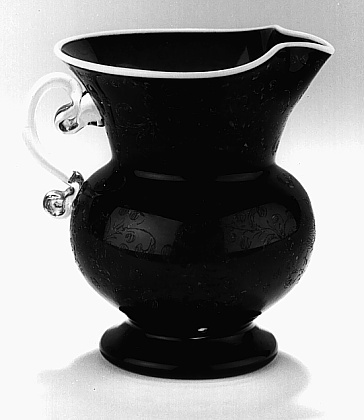 Helder blauw glas, helder kleurloos glas, opaak wit glas. Ingestoken bodem. Conische voet, overgaand in bolvormig lichaam met wijde conische hals en ingeknepen tuit. S-vormig oor van kleurloos glas, de uiteinden spiraalvormig ingerold. Op lichaam en hals een vogel, bloem- en bladranken. Op halsrand een witte glasdraad.
