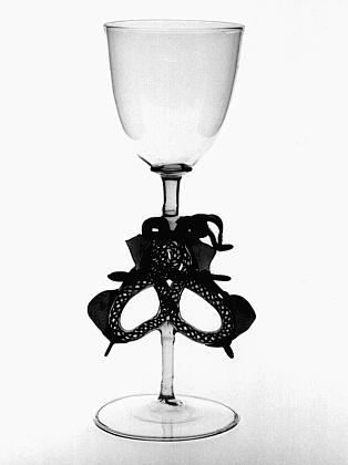 Helder kleurloos glas, opaak wit en rood glas. Licht conische voet met bovenwaarts omgeslagen rand. Stam met buis met witte en rode glasdraden. Twee gestileerde vogelkoppen en kammen van blauw glas met geknepen wafelpatroon en sporen van verguldsel. Schijf. Convex-conische kelk.- Trefwoorden