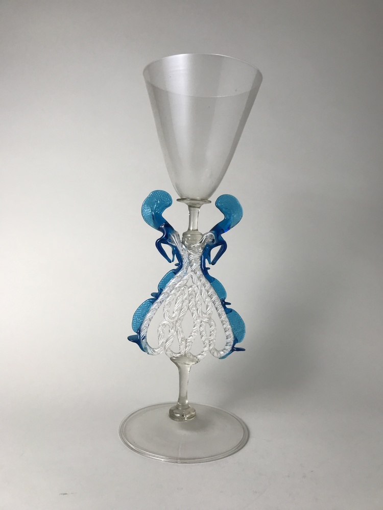 Helder kleurloos, helder blauw glas, opaak wit glas. Platte voet met omgeslagen rand. Basisknoop. Stam met geribde en gedraaide buis met witte glasdraden. Twee gestileerde vogelkoppen en kammen van blauw glas met geknepen wafelpatroon. Schijf. Conische kelk met afgeronde basis.
