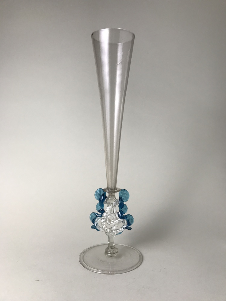 Helder kleurloos glas, helder blauw glas, opaak wit glas. Platte voet met omgeslagen rand. Basisknoop. Stam met geribde en gedraaide buis met witte glasdraden. Twee kammen van blauw glas met geknepen wafelpatroon. Schijf. Hoge conische kelk.