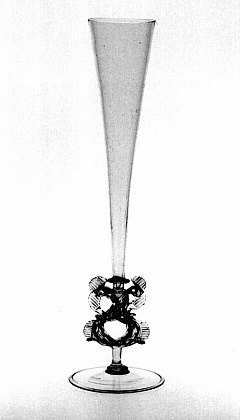 Helder kleurloos glas, opaak wit, rood en blauw glas. Licht conische voet met omgeslagen rand. Basisknoop. Stam met geribde en gedraaide buis met dubbele witte, rode en blauwe glasdraden. Twee kammen van helder kleurloos glas met geknepen ribbelpatroon. Schijf. Hoge conische kelk.