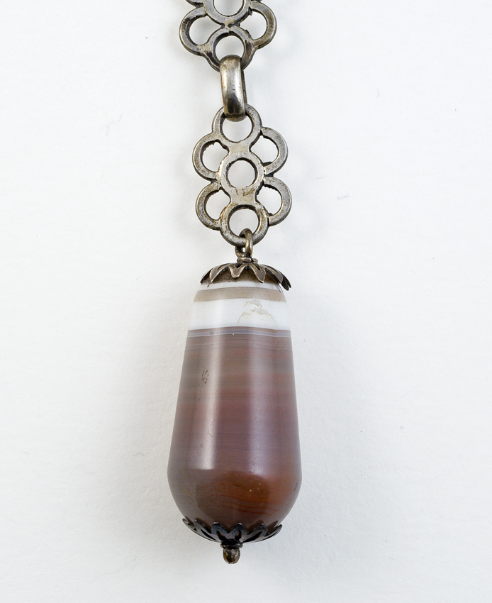 - Ovale gepolijste bruin-rode edelsteen amulet aan gedecoreerde ketting, 1900 - 1987
