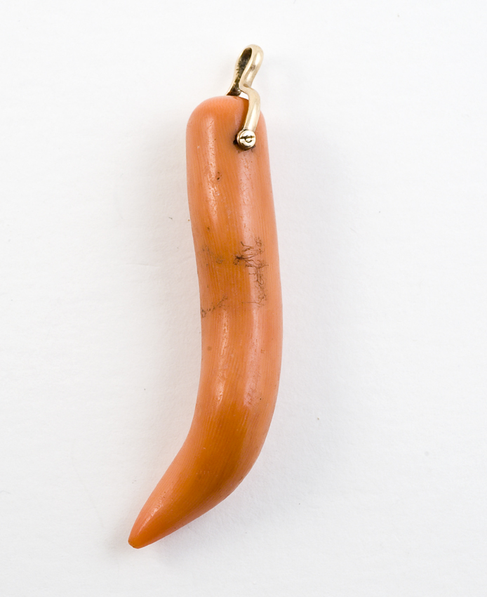 Amulet van bloedkoraal in de vorm van een ten of hoorn met metalen haakje aan de bovenzijde.- Trefwoorden