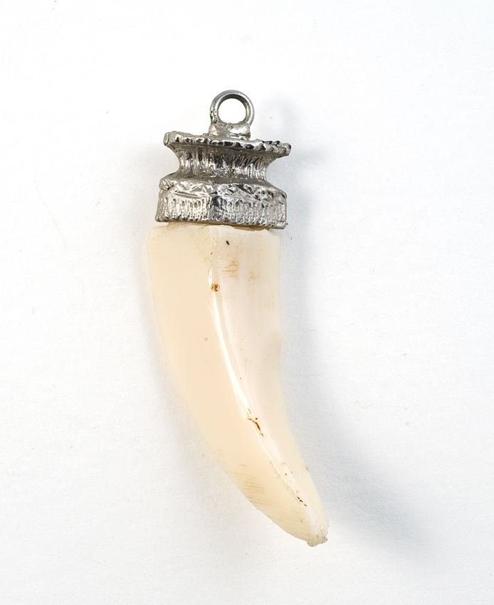 Amulet van wolfstand in metalen. concaaf cilindrische zetting met aan de bovenzijde een ringetje.- Trefwoorden