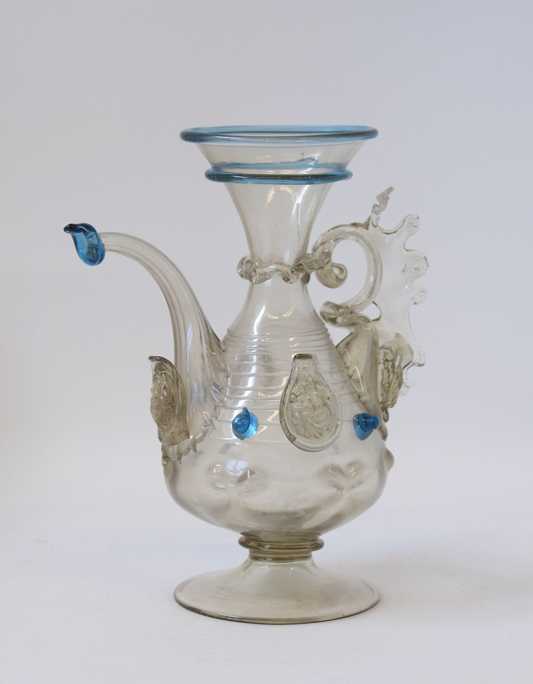 Helder kleurloos rookkleurig getint glas, helder blauw glas. Concaaf-conische voet. Schijf. Peervormig lichaam, de onderzijde met in de vorm geblazen en geknepen ribben, overgaand in slanke hals met zich verwijdende rand. Oor in de vorm van een gestileerd zeepaardje met geknepen kammen. Gebogen tuit met in de vorm geblazen ribben. Op lichaam alternerend vier mannenmaskers en vier blauwe noppen. Glasdraad rondom lichaam en gegolfde glasdraad rondom hals. Blauwe glasdraden op en onder rand en op tuit.