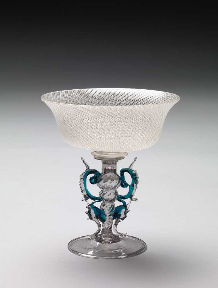 Helder kleurloos, grijs getint glas, helder blauw glas, opaak wit glas. Conische voet met omgeslagen rand. Basisschijf. Holle, geribde en gedraaide balusterstam met twee geledingen en schijf. Twee vleugels met gestileerde zeepaardjes van blauw glas met geknepen randen van helder kleurloos glas. Schaalvormige kelk met uitbuigende rand met witte glasdraden in vetro a reticello techniek.