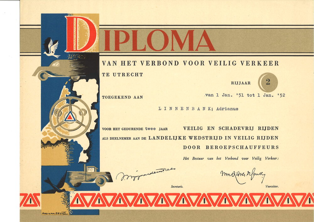 - Diploma voor een jaar veilig en schadevrij rijden als deelnemer aan de Landelijke Wedstrijd in Veilig Rijden door Beroepschauffeurs, rijjaar 2, op naam van Adriaan Linnenbank (1905-1980), 1951 - 1952