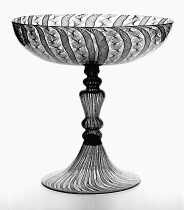 Helder kleurloos glas, opaak wit glas. Hoge concaaf-conische voet. Holle balusterstam met vier geledingen. Wijde schaalvormige kelk. Voet, stam en kelk met witte glasdraden in vetro a retorti techniek.- Trefwoorden