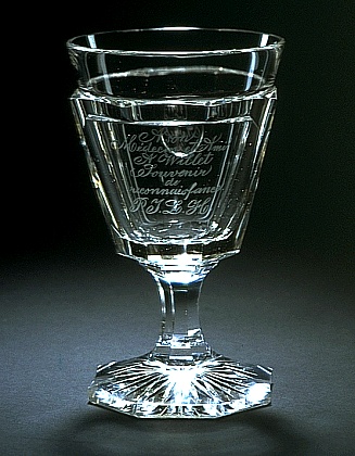 Helder kleurloos glas. Achtkantig gefacetteerde voet, overgaand in korte stam. Onderzijde voet in stervorm geslepen. Achtkantig gefacetteerde kelk met inspringende, conische mondrand. Op kelk een rechthoekig schild met het opschrift: A son/ Médecin et Ami/ A Willet/ Souvenir/ de/ reconnaissance./ P.J.L.H./. Op andere zijde in rond schild de datering: 1844/ Avril/ 3./.