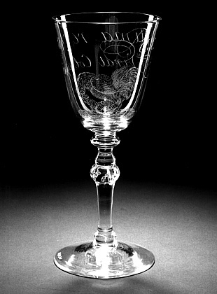 Helder kleurloos glas. Conische voet. Basisknoop. Balusterstam met gedraaide luchtbellen en twee knopen. Conische kelk met afgeronde basis. Op kelk een tredende haan op een hen en opschrift. Gesigneerd en gedateerd op onderzijde voet.