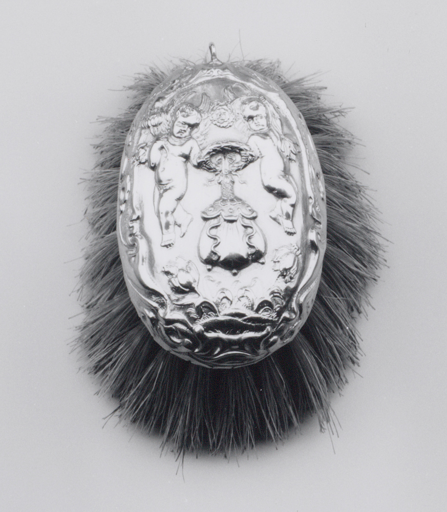 Deze borstel met een rijk gedecoreerde zilveren dekplaat is gebruikt voor het afborstelen van kleding. Zilveren platen als de hier getoonde werden los verhandeld en vervolgens op een borstel naar keuze bevestigd. Hiertoe werden de kleine tandjes langs de rand van de plaat om het ovale houten borstelblok gebogen. Met een aan de bovenzijde bevestigde ring kon het voorwerp worden opgehangen. Zie voor een verwante, in kwabstijl gedecoreerde Nederlandse borstelrug: veilingcat. Sotheby's Amsterdam 13-5-2002, p. 44 nr. 124. Niet-gemonteerde borstelruggen zijn afgebeeld op een anonieme prent naar Jan Luyken, uitgebracht als aankondiging van een in 1689 te Durgerdam gehouden loterij van zilveren voorwerpen. Ze worden daar 'Kleer-Schuyers-Platen' genoemd (Ter Molen 1992/93, p. 112 afb. 1, p. 123-124). Zie inleiding Vreeken, p. X. ( Bert Vreeken)