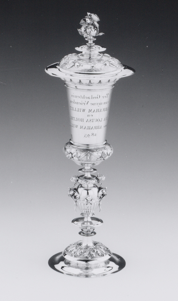 Bokaal met gewelfde voet, balustervormige stam, conische kelk en gewelfd deksel. Voet met vlakke rand, de bovenzijde gedreven met straalsgewijs een rij acanthusbladeren op geruwde ondergrond. Stam met baluster tussen platte schijven. Onderste helft baluster gegroefd, bovenste helft glad. Baluster gemonteerd met vier griffioenen en rozetten. Kelk met gladde wand, de verdikte basis gedreven met alternerend bloemen en gestrikte guirlandes. Eierlijst met pijlen langs bovenrand kelk. Op wand is gegraveerd: Ter Gedachtenis/ van myne Vrienden/ ABRAHAM WILLET/ en/ SANDRINA LOUISA HOLTHUYSEN/ weduwe ABRAHAM WILLET/ 1895./, alsmede in monogram de initialen: DF/. Gewelfd deksel met vlakke rand, de bovenzijde gedreven met alternerend bloemen en gestrikte guirlandes. Dekselknop in de vorm van bloem- en bladertakken.