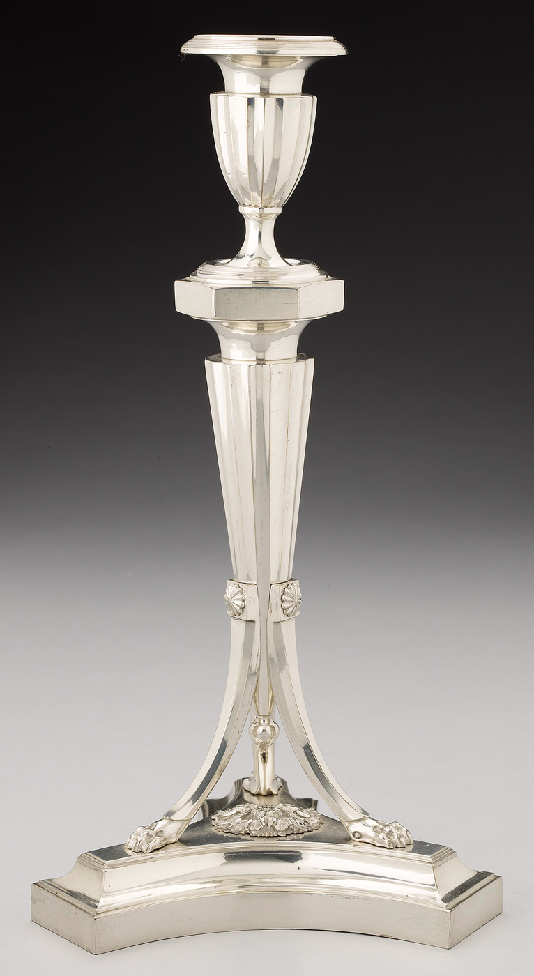 Kandelaar met driekantige voet, taps toelopende stam en vaasvormige kaarsenhouder. Voet met geprofileerde rand, ingezwenkte zijden en afgeschuinde hoeken. Bovenzijde voet opgelegd met rozet. Op voet een houder in de vorm van een antieke drievoet op leeuwenklauwen, door middel van drie rozetten bevestigd aan stam. Stam met cannelures, de onderzijde met bolvormige knop. Bovenzijde stam met zeshoekige nodus, waarboven gecanneleerde kaarsenhouder en losse ronde vetvanger. Filetranden langs onderzijde kaarsenhouder en rand vetvanger.