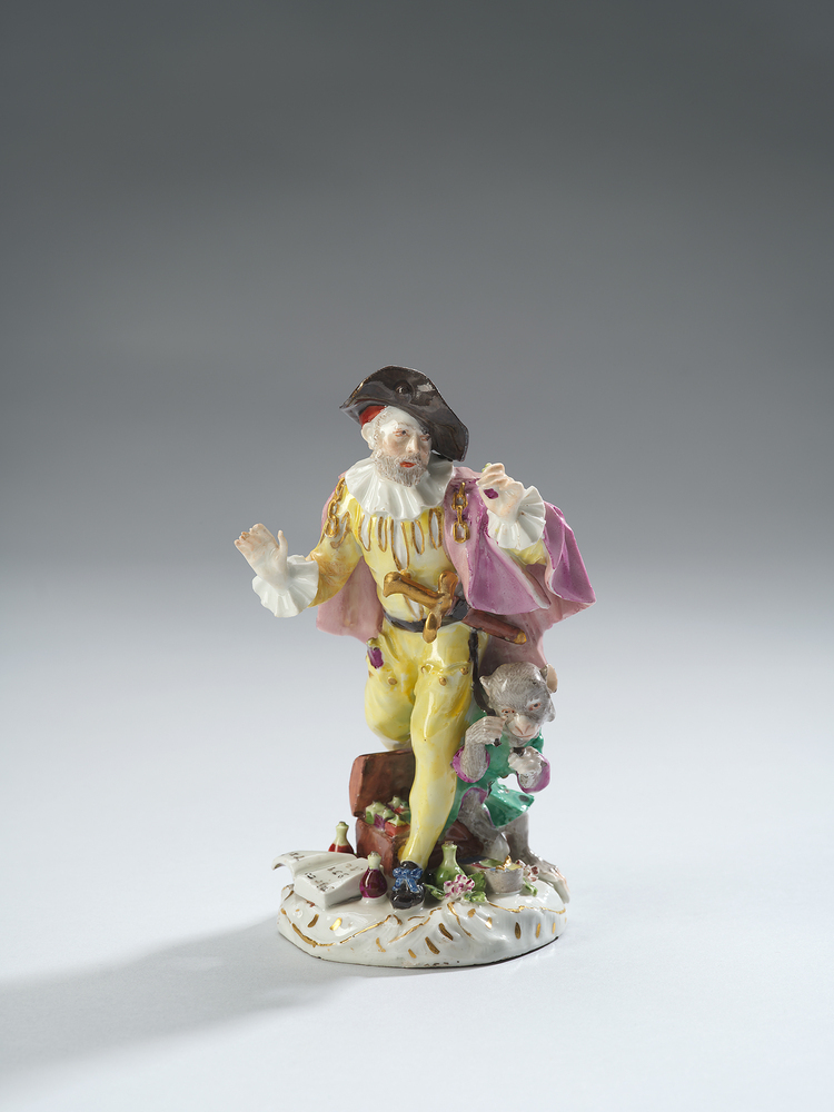 Porseleinen beeldje van een kwakzalver, staand, zijn waren aanprijzend. Hij draagt een geel kostuum, paarse schoudermantel, zwarte hoed en een zwaard op de linkerheup. Aan zijn voeten staan een aapje, een medicijnkoffertje, een openliggend boek en enkele losse flesjes.