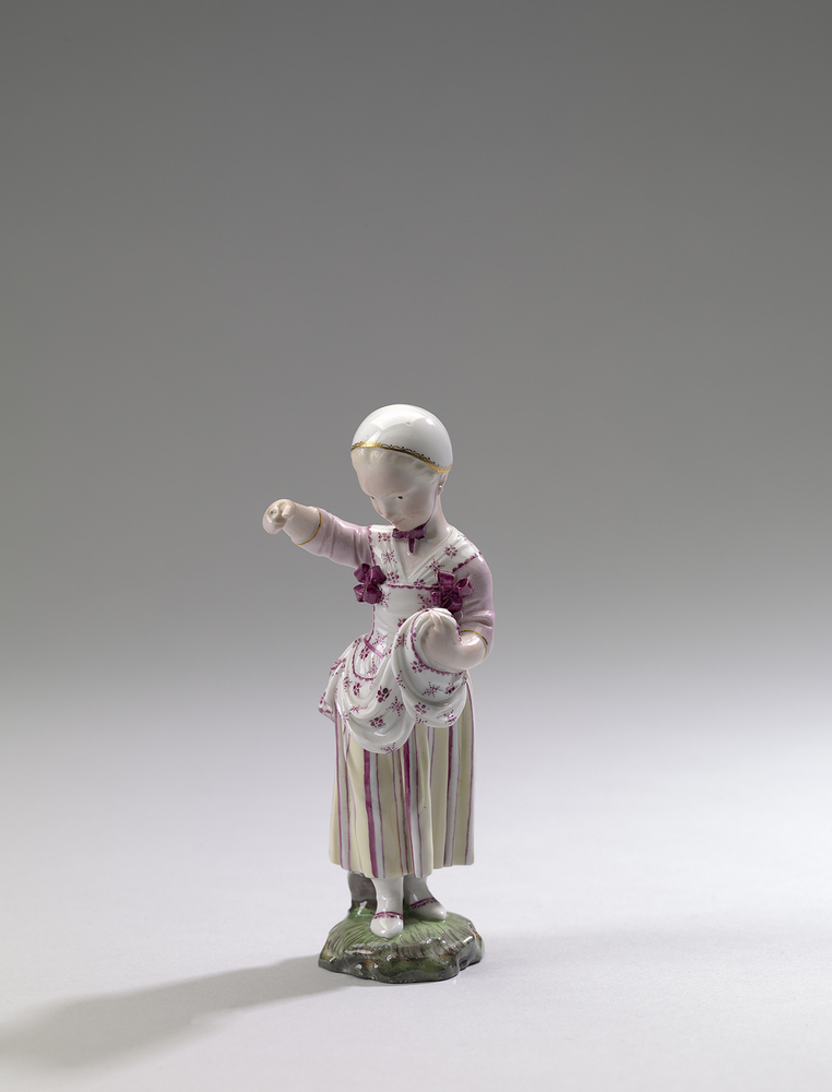 Figuur beschilderd op het glazuur met emaillekleuren. De figuur stelt een meisje voor dat zaad strooit- Trefwoorden