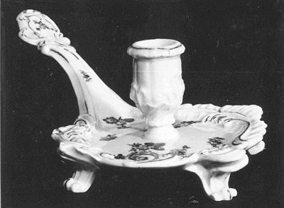 Blaker is bladvormig met steel op vier pootjes met een verguld rocaille ornament aan elke poot, rand en steel, rocaille aan de steel is onverguld, verder wit fond en strooibloemen decor.- Trefwoorden