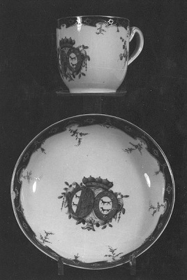 Hoog model kop met rocaille-oor, langs de randen van kop en schotel banden in koningsblauw, rocaille voluten en afhangende bloemtakken in goud. Op kop en schotel veelkleurig het alliantiewapen van Jacob Lopez de Liz en van zijn echtgenote, behorend tot het geslacht Lopez Suasso, in een gekroonde cartouche. Op het kopje ook twee veelkleurige strooiboeketten.