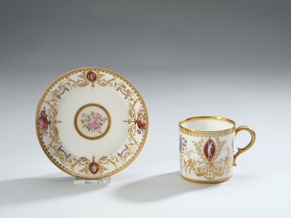 Kop is rond met een verguld oor en heeft over de gehele breedte een decoratie van vergulde ranken, parels en cameeën op rood fond, en veelkleurige bloemvazen; de schotel heeft in de rand dezelfde versiering met in het midden een rozenboeket in ronde rand.