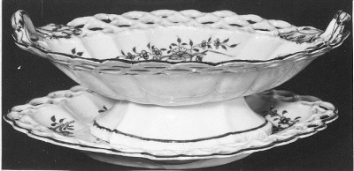 Ruitvormige schaal, met platte rand van vlechtreliëf, op ingesnoerde voet, gezet op naar boven lopende onderkant. Twee opstaande oren met bladeren aan de aanzet. Schotel heeft dezelfde vlechtrand, gaten in de vorm van ruiten, ovalen en rondjes.