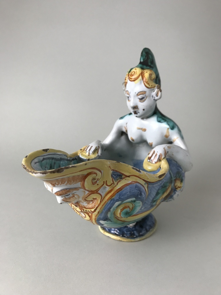 Kom op ingesnoerde voet, in de vorm van een gehurkte faun, een wijde tuit met mascaron, eikels en voluten in reliëf. Decor in onderglazuur in blauw, groen, geel en bruin; aan de binnenzijde een landschap.- Trefwoorden