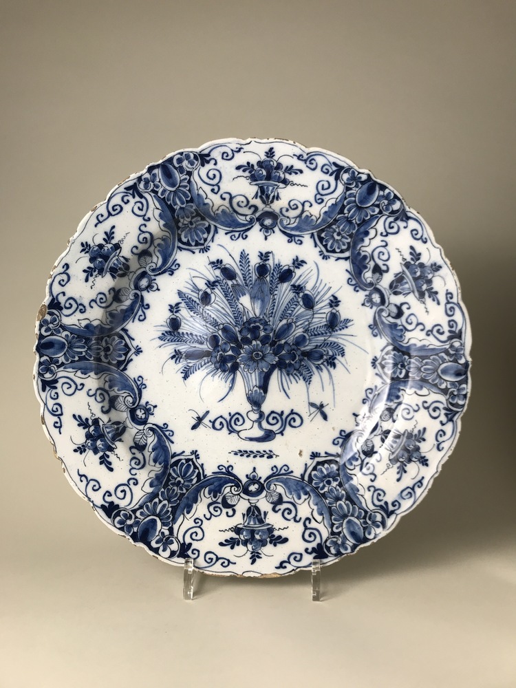 Rond model, blauw decor, in het midden vaas met bloemen en insecten, op de rand vruchten in bak, voluten en bloemen.- Trefwoorden
