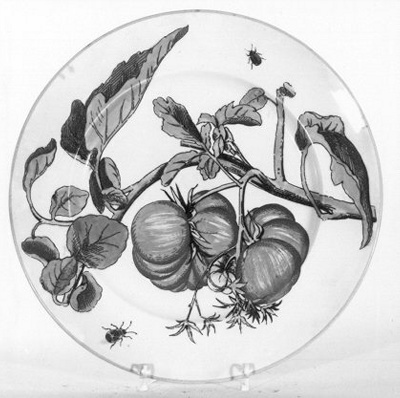 Rond platbord in een creme-wit onderglazuur beschilderd in polycrhoomemail tot op de bordrand met een afbeelding van twee trostomatennag aan de tak met bladedren en knoppen, op de bordrand tegen over elkaar twee verschillende kevertjes en een gele bies om de bordrand.- Trefwoorden