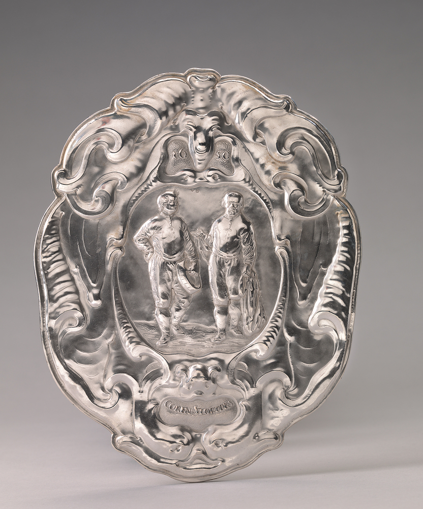 Cartouchevormige plaat met een medaillon waarin een gedreven voorstelling van twee korenstorters. Op twee schilden twee staande figuren, de linker met een korenmaat en de rechter met een zak. Rand opgebouwd uit kwabornamenten met op boven- en onderzijde cartouches waarin op geruwde grond het jaartal: 1650/ alsmede het opschrift: COREN STORTERS/.- HerkomstVervaardigd voor het Korendragers- en Korenstortersgilde, Amsterdam, 1650; veiling H.G. Bom, Amsterdam, 12-7-1907, nr. 1617, aangekocht met steun van het Koninklijk Oudheidkundig Genootschap, Amsterdam