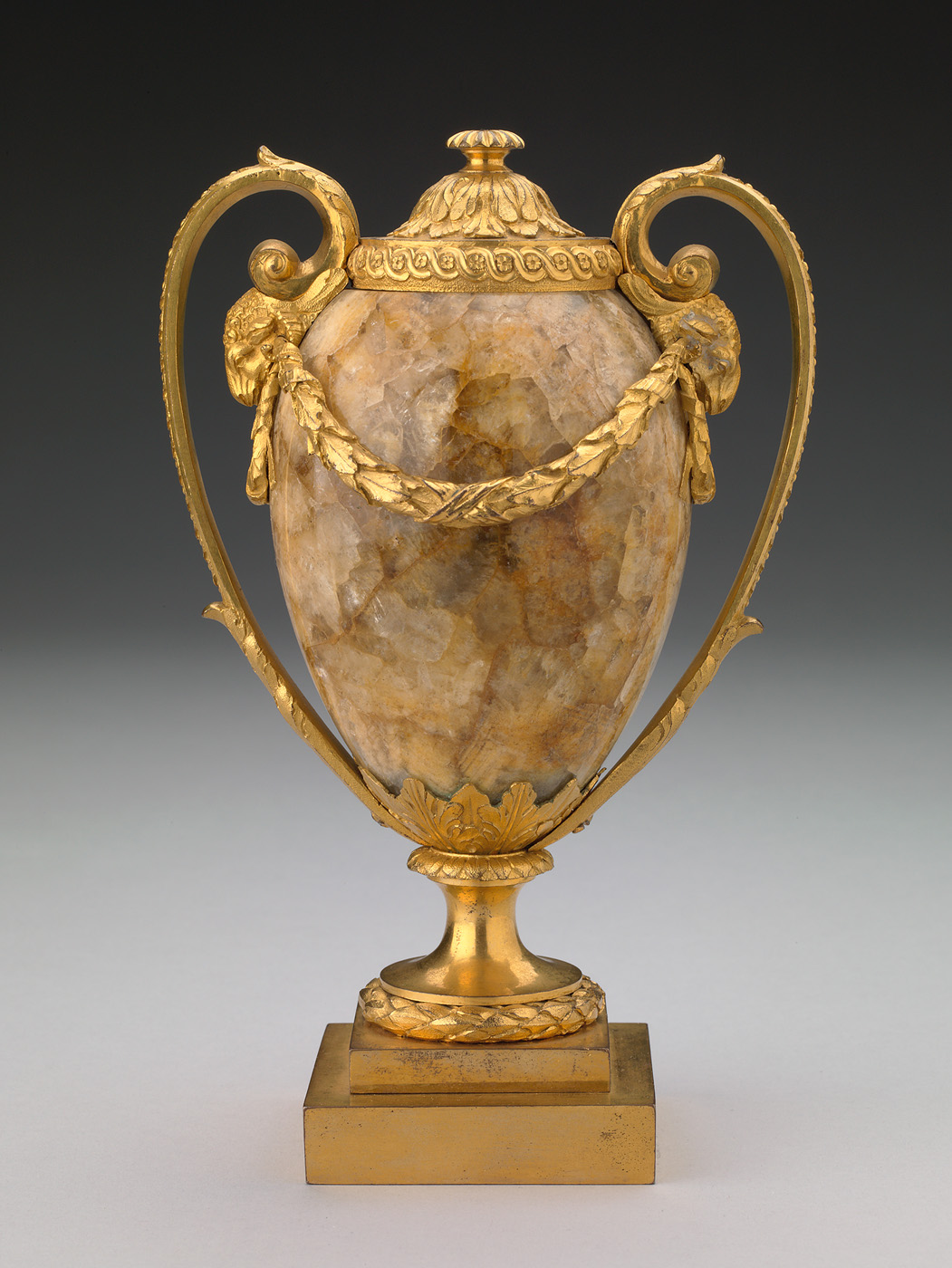 Een paar 'geitenkoppen' kandelaar-vazen, het ei-vormige lichaam is gemaakt van zogenaamd Blue John-steen. gevat in vuurvergulde setting. De deksel van de vaas kan worden omgedraaid zodat deze gebruikt kan worden als een kandelaar.- Trefwoorden