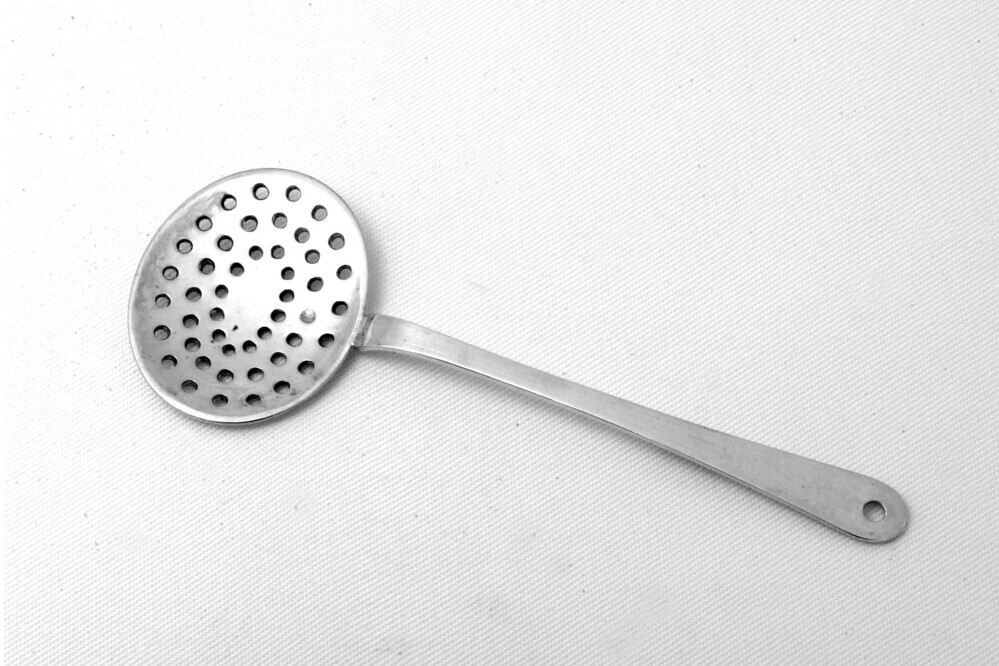 Lichtgewelfde ovale bak met gaatjes in drie rijen, lange steel met puntige aanzet en in het uiteinde een gat.