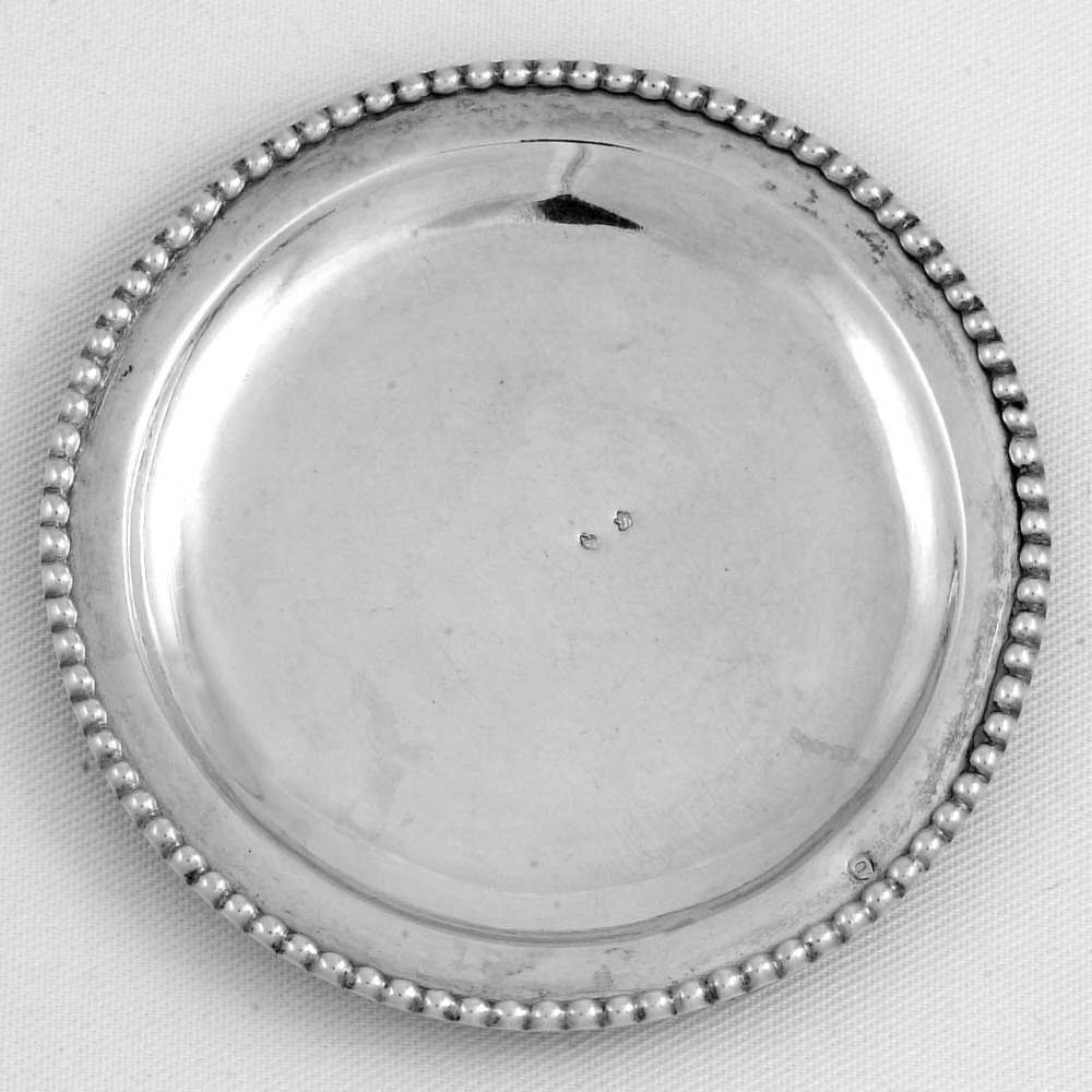 Mogelijk geen miniatuurzilver. Ronde schotel met verdiepte bodem en vlakke rand, afgezet met grove parelrand.