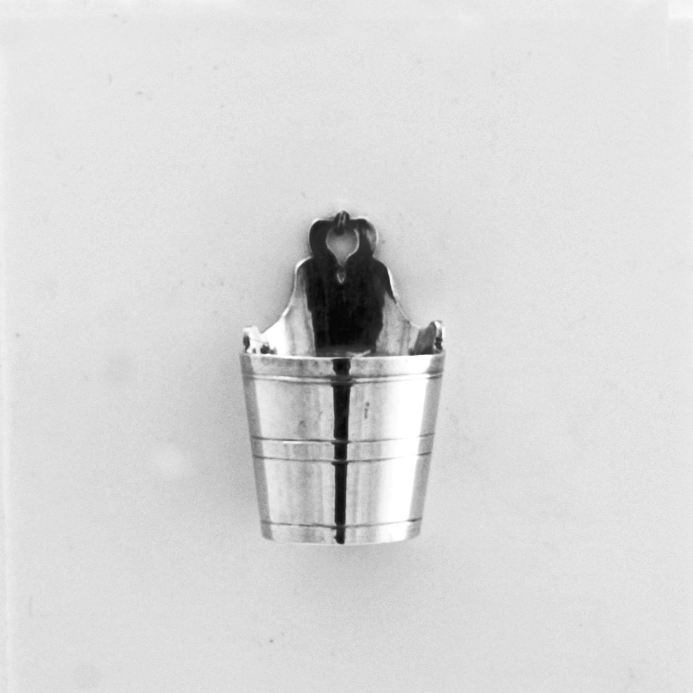 Vlakke bodem, gladde cilindrische wand een weinig uitlopend en voorzien van drie dubbele gegraveerde lijnen; de achterwand doorlopend in een hoge schoudervorm met hartvormig ophangoog.