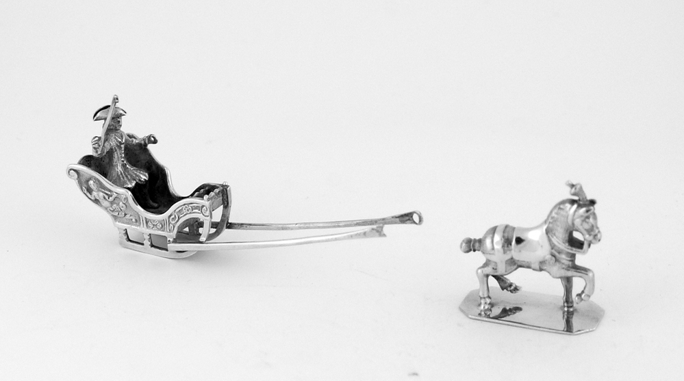 Arreslede met voerman, 1767 Amsterdam zilver hoogte: 4.45 cm; lengte: 9.22 cm; breedte: 2.48 cm; gewicht: 27.83 gram; stadskeur met jaarletter onderzijde voetplaat paard: Amsterdam