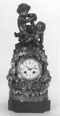 Franse pendule op zwart marmeren basemant met gecanneleerde zuil met wingerd en klimop, bekroond met twee stoeiende putti met druiven. Wit emaille wijzerplaat met minutenring met cijfers en uren in romeinse cijfers, plaat omlijst met een soort van rolwerk.- Trefwoorden