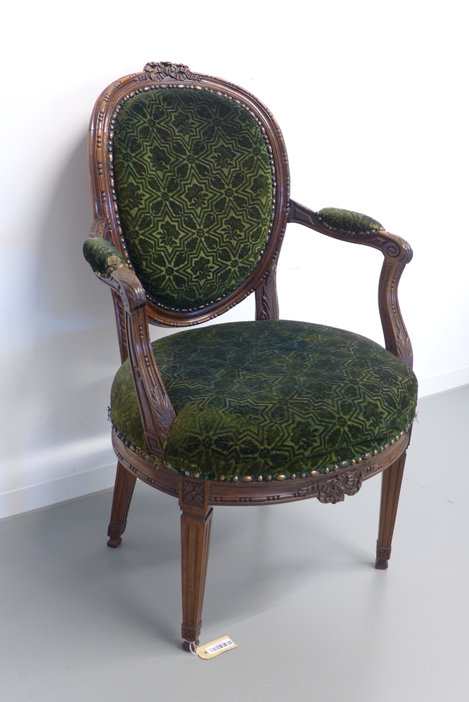 - hout (mahonie), eiken, trijp, passement, paardenhaar, stoffeerkatoen