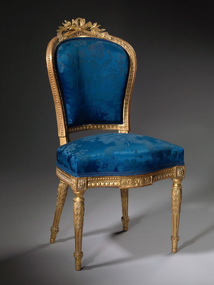 - Deze vergulde 19de-eeuwse stoel heeft alle uiterlijke kenmerken van een 18de-eeuws model. Het is uitgewerkt in neoclassicistische Lodewijk XVIe stijl met rozetten en gekruiste pijlenbundels. Het verrassende nieuwe zit in het binnenwerk. Dat is opgebouwd rond stalen springveren, een 19de-eeuwse uitvinding die het zitcomfort vergroot. ( Annemarie den Dekker)