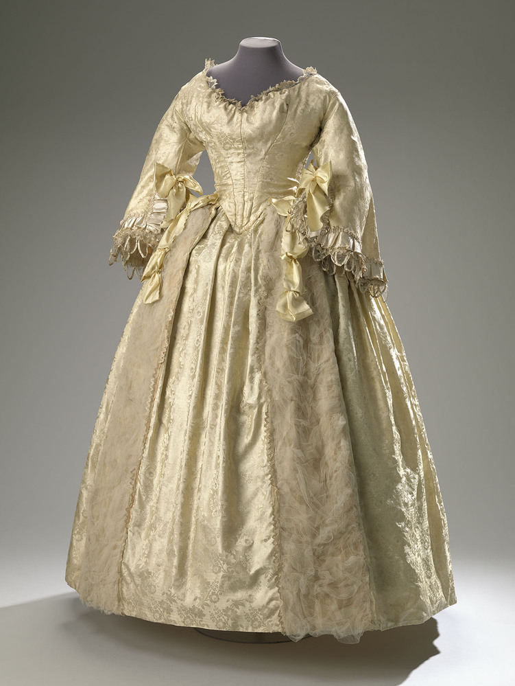 Vermaakt: De vorm van de pagode mouwen is modieus in de jaren 1850. De mouwen zijn vermaakt van een smalle nauwsluitende mouw naar een pagodemouw. Het was waarschijnlijk een luxe dagjapon uit ca. 1840-1850, maar is later vermaakt tot verkleedjapon voor een bal masque. Het was waarschijnlijk de bedoeling om het op een achttiende eeuws silhouet te doen lijken.
