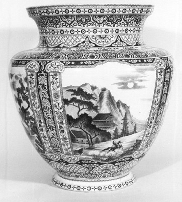 Vaas van aardewerk, geglazuurd met blauwe decoratie, chinoiserie.- Trefwoorden