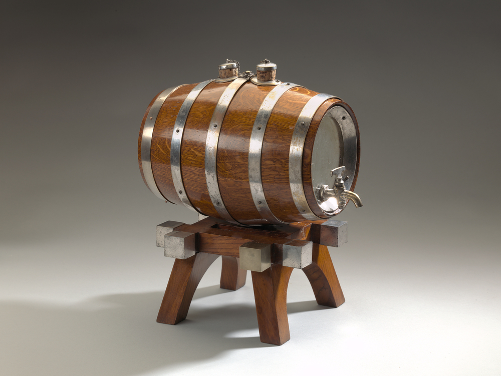 Met eikenhouten duigen lijkt het één vat maar het bevat twee porseleinen reservoirs die afgedekt worden door glazen ruitjes bij wijze van vatbodems waarin een kraantje steekt. Wanneer je een glaasje tapt, kan goed het peil van de drank gezien worden, dat was kennelijk het idee. Het vaatje is behoorlijk verzorgd uitgevoerd met verzilverd beslag en gepolitoerd eiken en het zal niet misstaan hebben in de ‘minibar’ van een herenkamer. ( Jaap Boonstra)