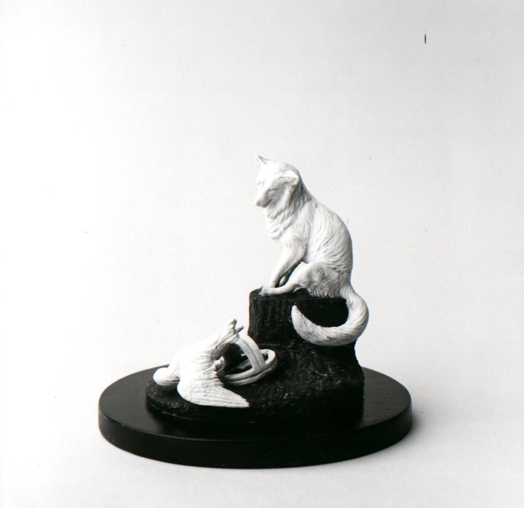 - Vos, zittend op een boomstronk, waarbij een vogel in klem, 1865 - 1890