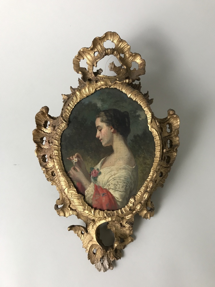 Jong meisje die margriet ontbladert, gevat in fijn gesneden lijstje, verguld met rococo kuiven- Trefwoorden