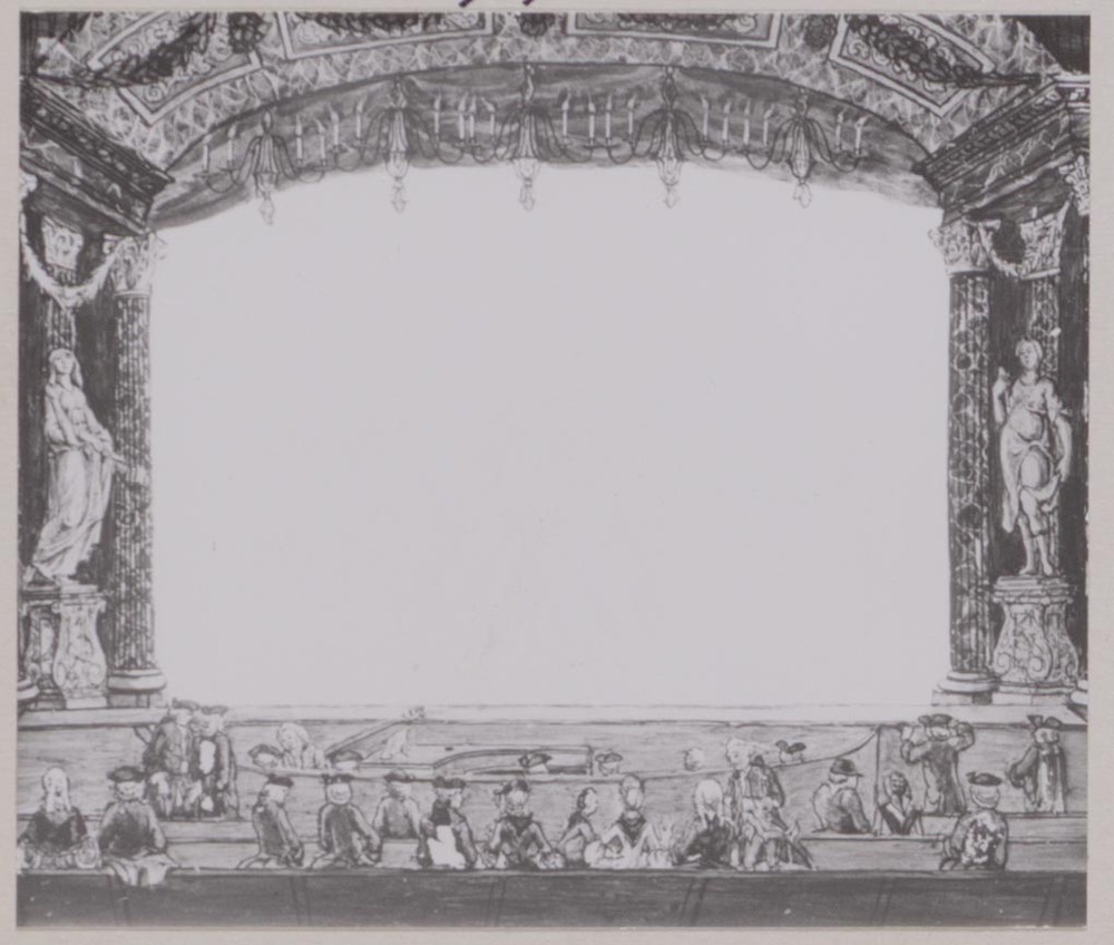 Drie beschilderde glasplaten, zonder lijst: 1. orkestbak met toeschouwers, 2. theater scène 3. theaterdèco.- Trefwoorden