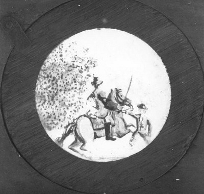 in een langwerpig houten raam is een rond glaasje gevat, een ander glaasje kan er overheen bewogen worden door een ijzeren schuifje.- Trefwoorden