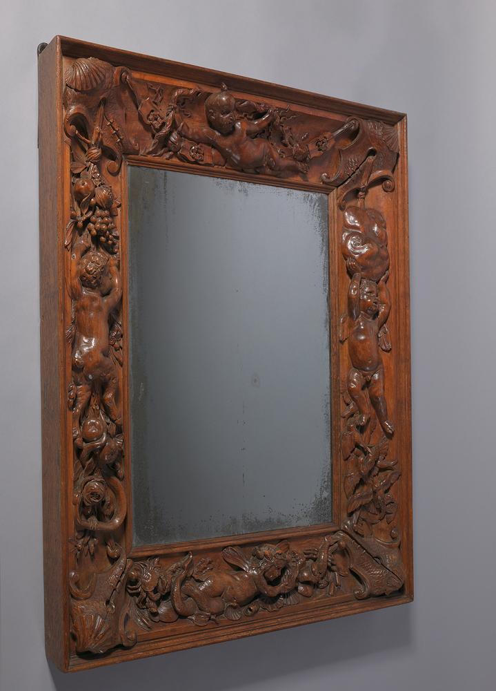De spiegel is afkomstig uit het stadhuis. Op de lijst staan de vier elementen afgebeeld waaruit, naar men in de klassieke Oudheid dacht, de wereld was opgebouwd: aarde, water, vuur en lucht. Het was in de 17de eeuw zeer gebruikelijk dat kunstenaars motieven ontleenden aan de Griekse en Romeinse cultuur.