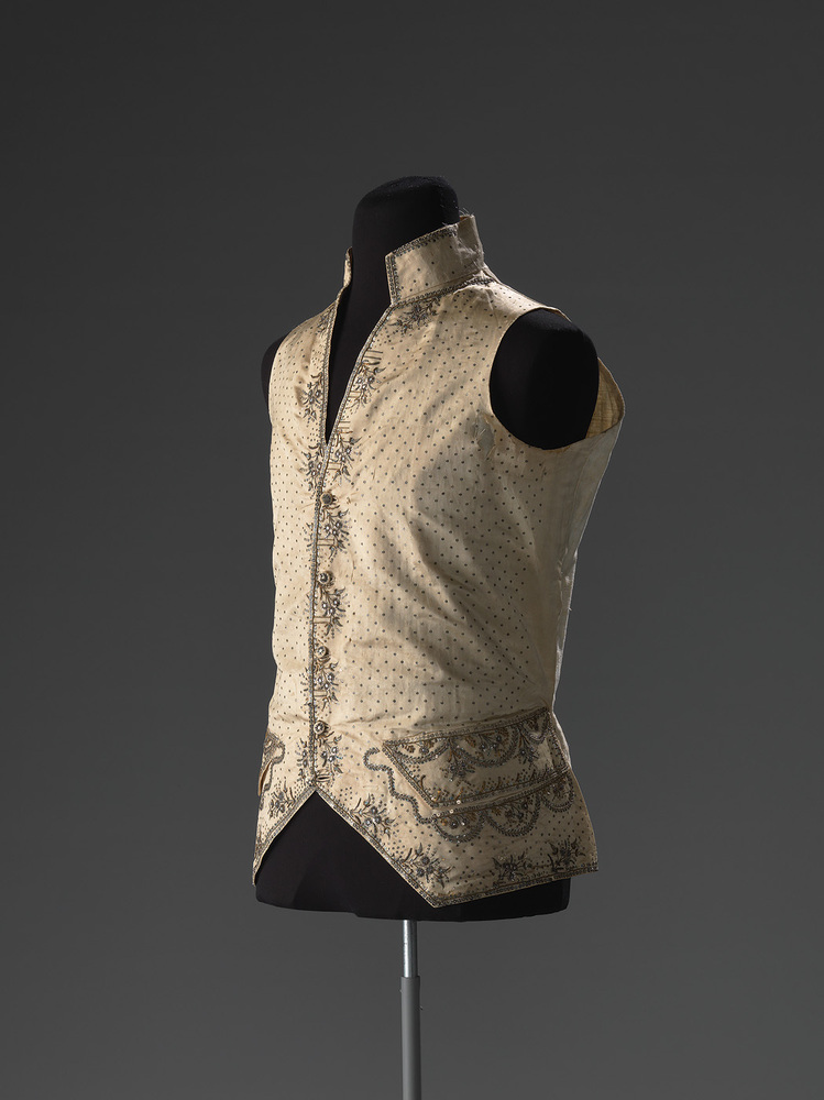 Herenvest met voorpanden van naturelkleurige zijde en achterzijde van crèmekleurig linnen. V-hals met opstaande halsboord. Sluiting middenvoor door middel van vijf met stof overtrokken knopen. De voorpanden lopen schuin weg. Klepzakken op heuphoogte. De voorzijde is geborduurd met kleine pailletten en goud- en zilverdraad. Langs de randen en op de klepzakken bloem- en slingermotieven. Onderaan op de rug twee linnen strikbanden, die in de zijnaden zijn vastgemaakt en door gefestonneerde gaatjes naar buiten zijn gehaald.